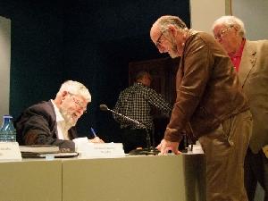 La mesa fue compartida acompañando al autor el periodista y escritor Juan Gaitán, que hizo una crítica literaria sobre la novela y el doctor Diego Maldonado que presentó la parte personal del escritor.