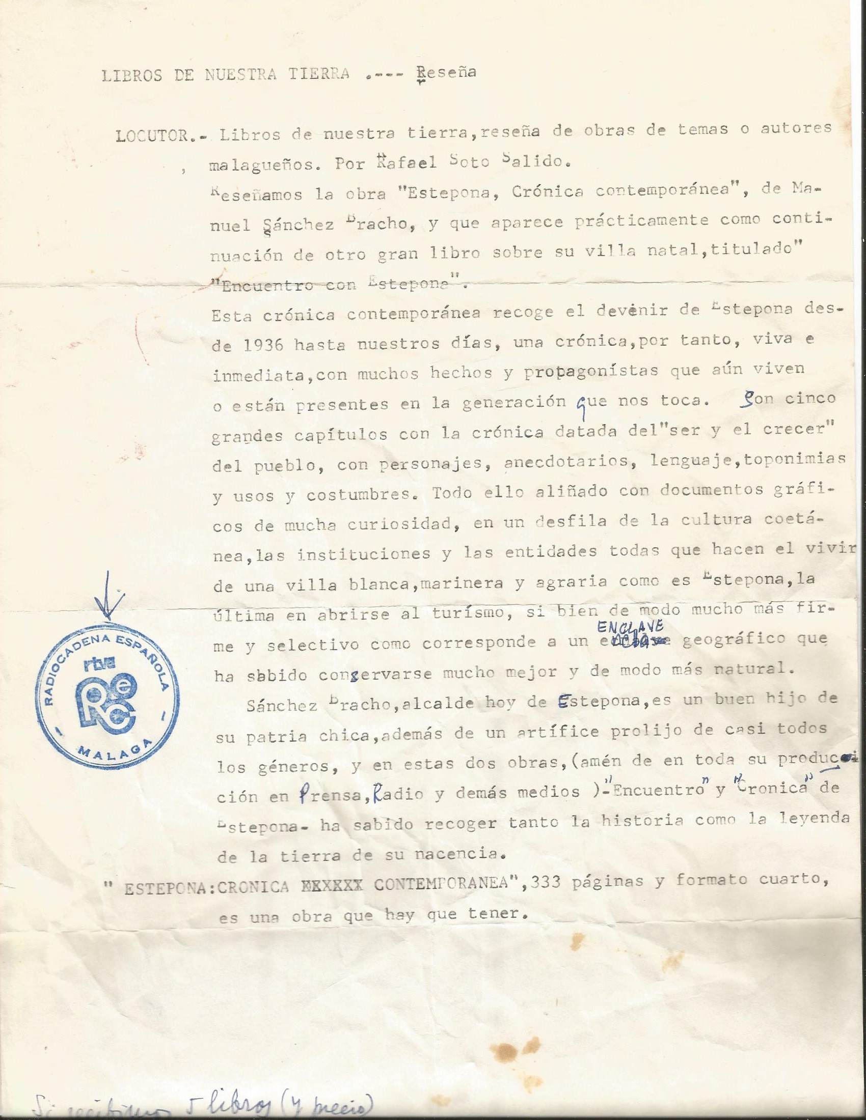 Reseña de Rafael Soto Salido en radiocadena española sobre el libro Estepona Crónica contemporanea